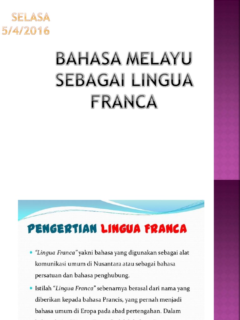 Bahasa melayu sebagai lingua franca sejarah tahun 5. Kepentingan bahasa melayu sebagai bahasa ilmu. Lingua franca ditakrifkan berdasarkan fungsi tanpa mengambil kira sejarah atau struktur bahasa itu. Lingua franca dari bahasa itali bererti bahasa frank atau bahasa perantara merupakan bahasa perantaraan yang digunakan secara sistematik untuk tujuan perhubungan antara orang orang yang tidak sama bahasa ibundanya khususnya bahasa ketiga yang berbeza dari bahasa ibunda dua belah pihak.