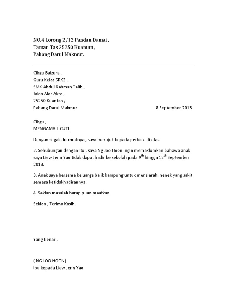 Contoh Surat Tidak Hadir Ke Sekolah Yang Rasmi Untuk Cuti