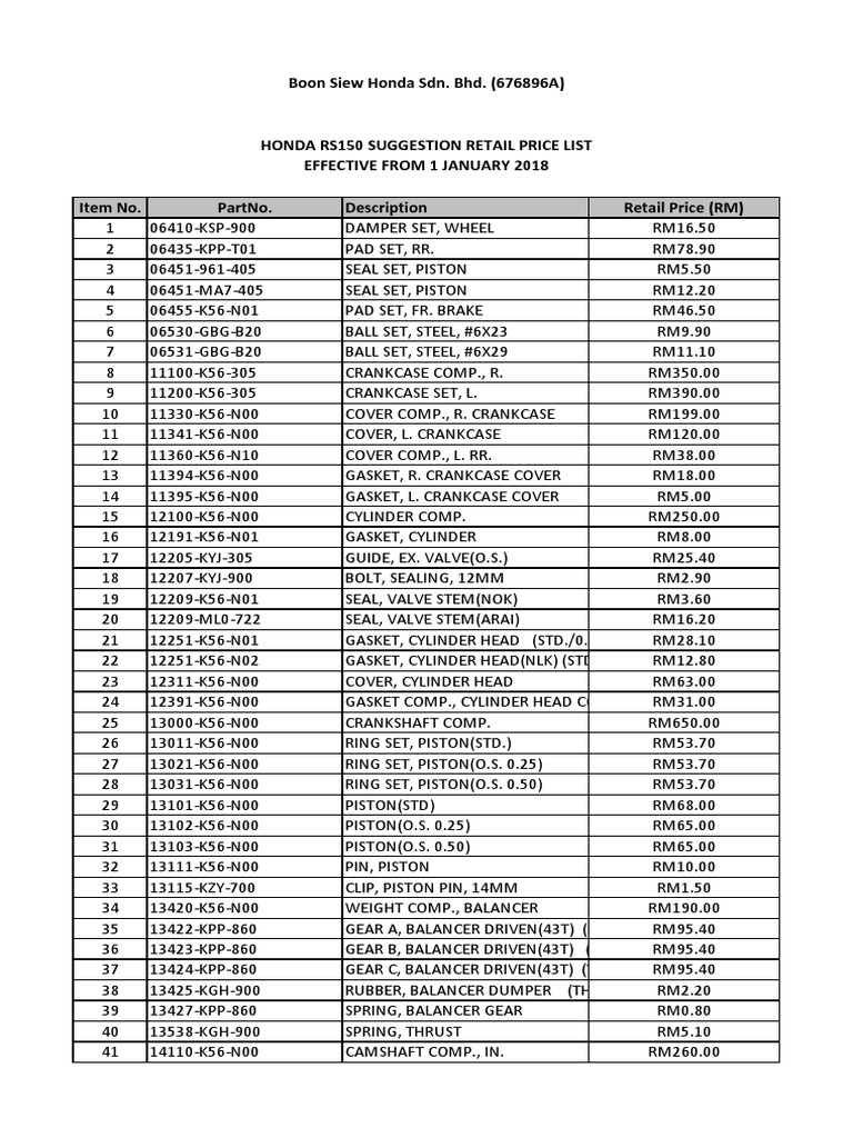 Honda Motorcycles Malaysia Genuine Spare Parts Catalog