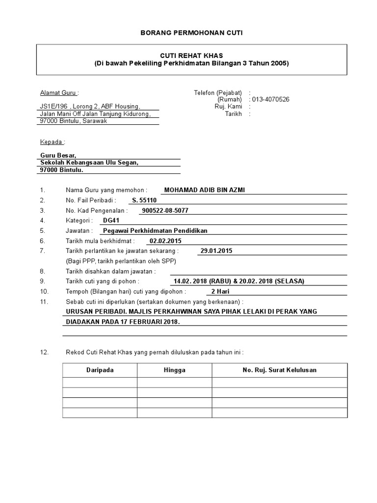 Borang Cuti Jual Cuti Rehat Khas Guru Xls Document