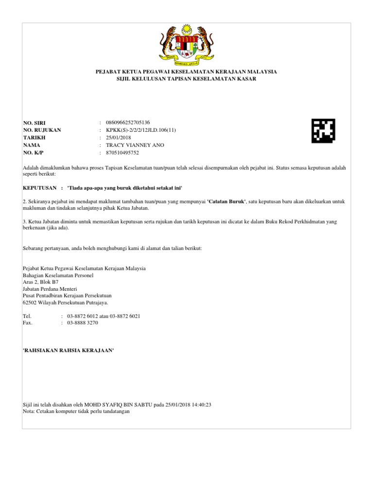 Pejabat Ketua Pegawai Keselamatan Kerajaan Malaysia Sijil Kelulusan Tapisan Keselamatan Kasar