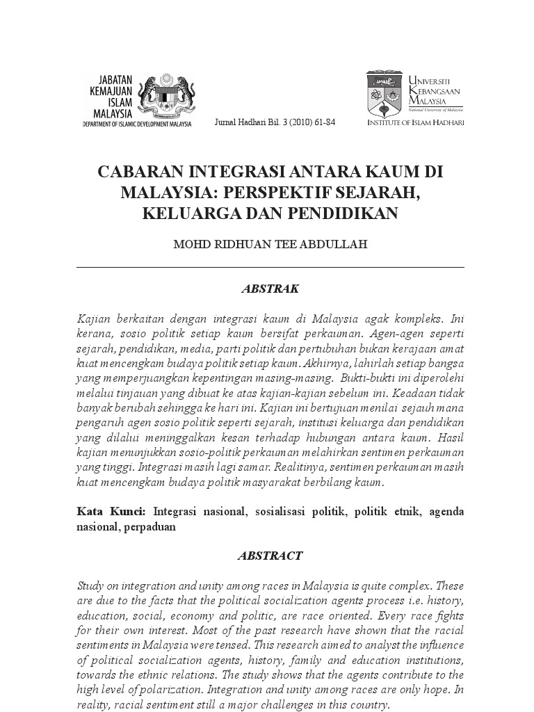 Pdf Cabaran Integrasi Antara Kaum Di Malaysia Perspektif Sejarah Keluarga Pendidikan Dan Agama John Bill Academia Edu