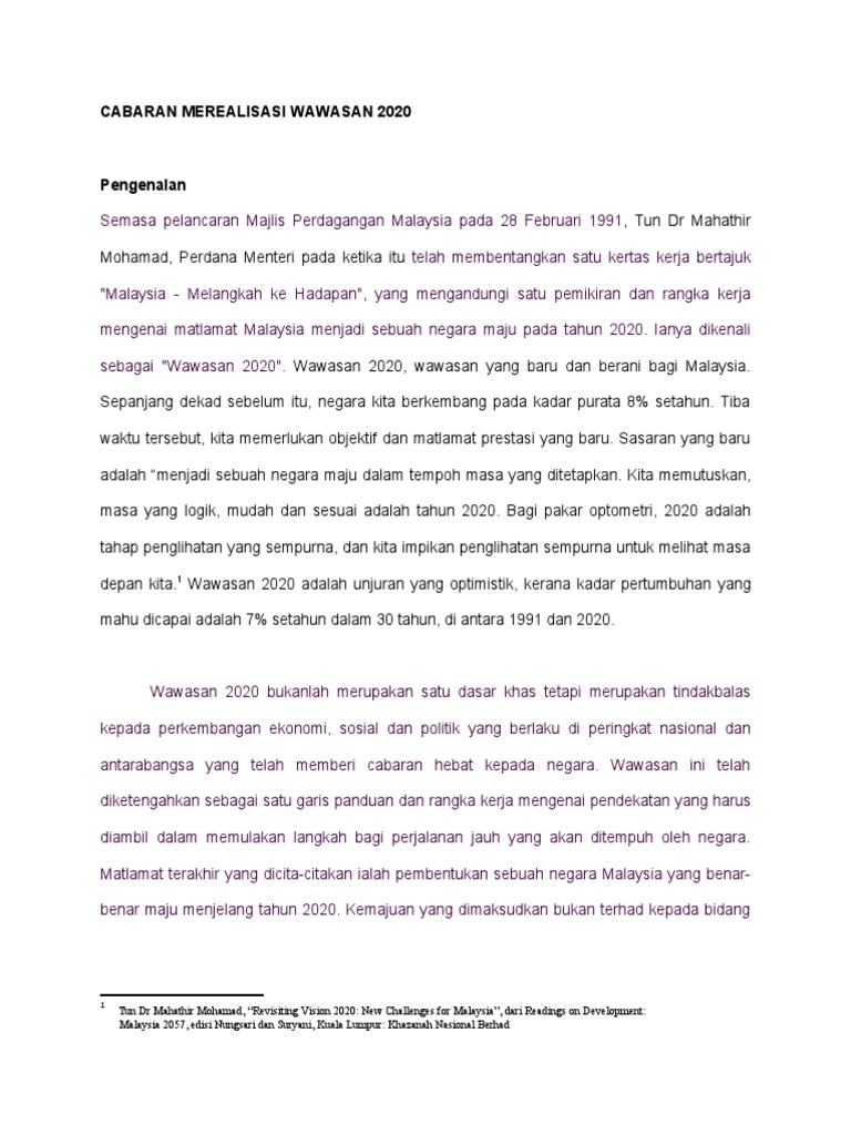Cabaran dalam merealisasikan wawasan 2020 free download as word doc doc docx pdf file pdf text file txt or read online for free. Membina bangsa malaysia yang bersatupadu diletakkan sebagai cabaran pertama wawasan 2020. Huraikan cabaran dan strategi utama negara malaysia dalam usaha merealisasikan wawasan 2020 pengena.