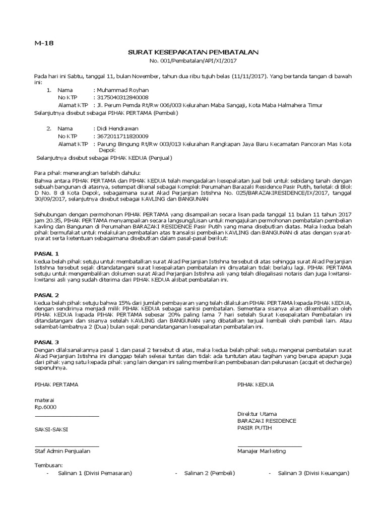 Contoh Surat Pembatalan Jual Beli Tanah Pdf