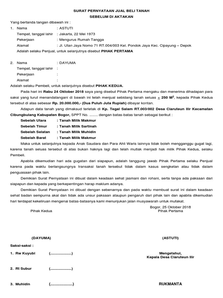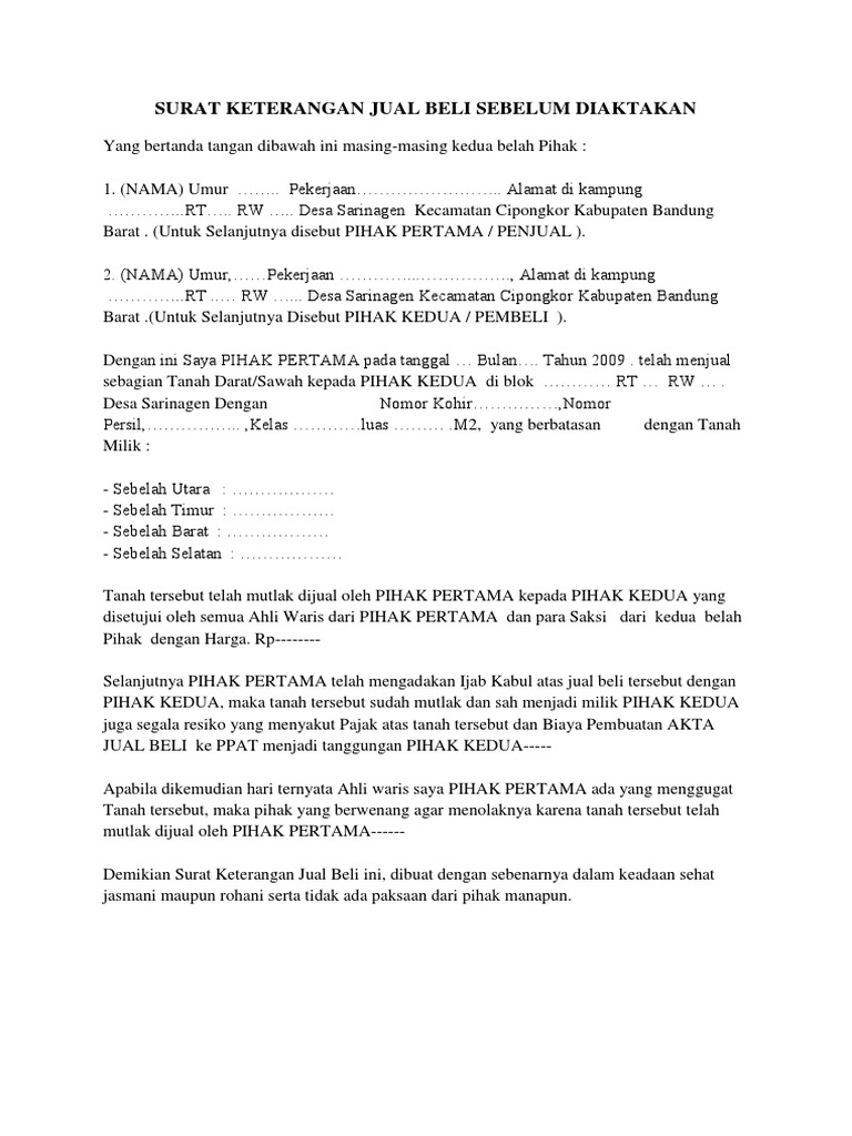 Contoh Format Surat Jual Beli Tanah Sebelum Diaktakan