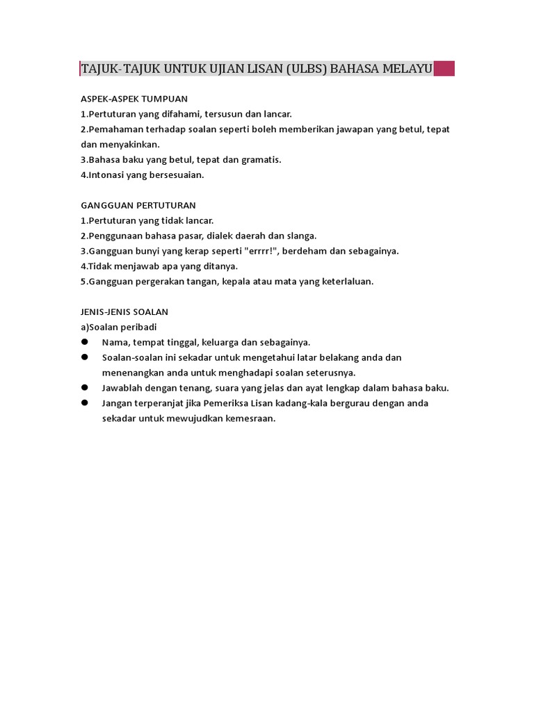 Ujian Lisan Bertutur Bahasa Melayu Pt3 Contoh Soalan